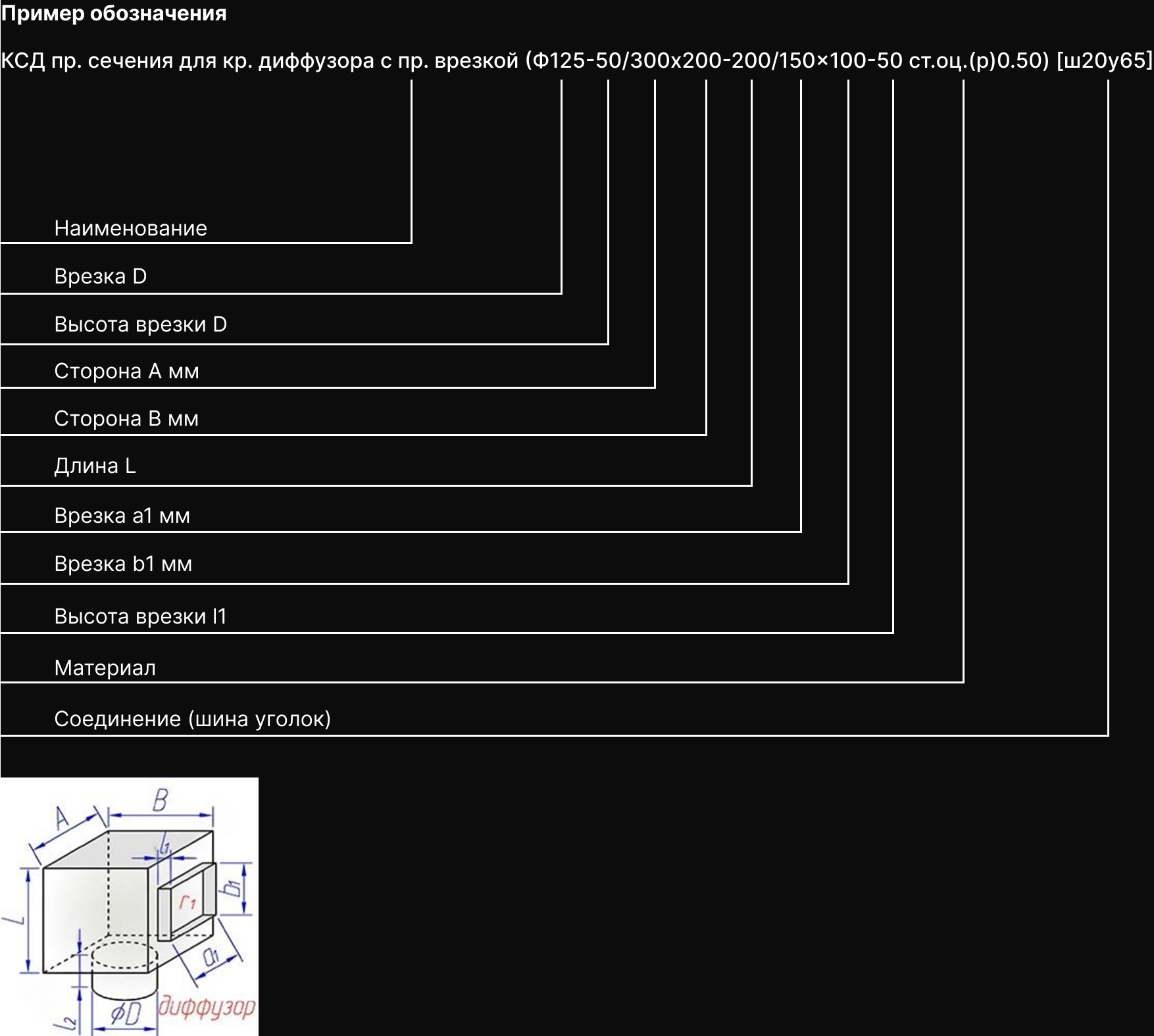 | КСД пр. сечения для кр. диффузора с пр. врезкой | Ф125-50/300×200-200/150×100-50 | ст. оц.(р)0.50 | ш20у65 | 0,42 | 1,65 |