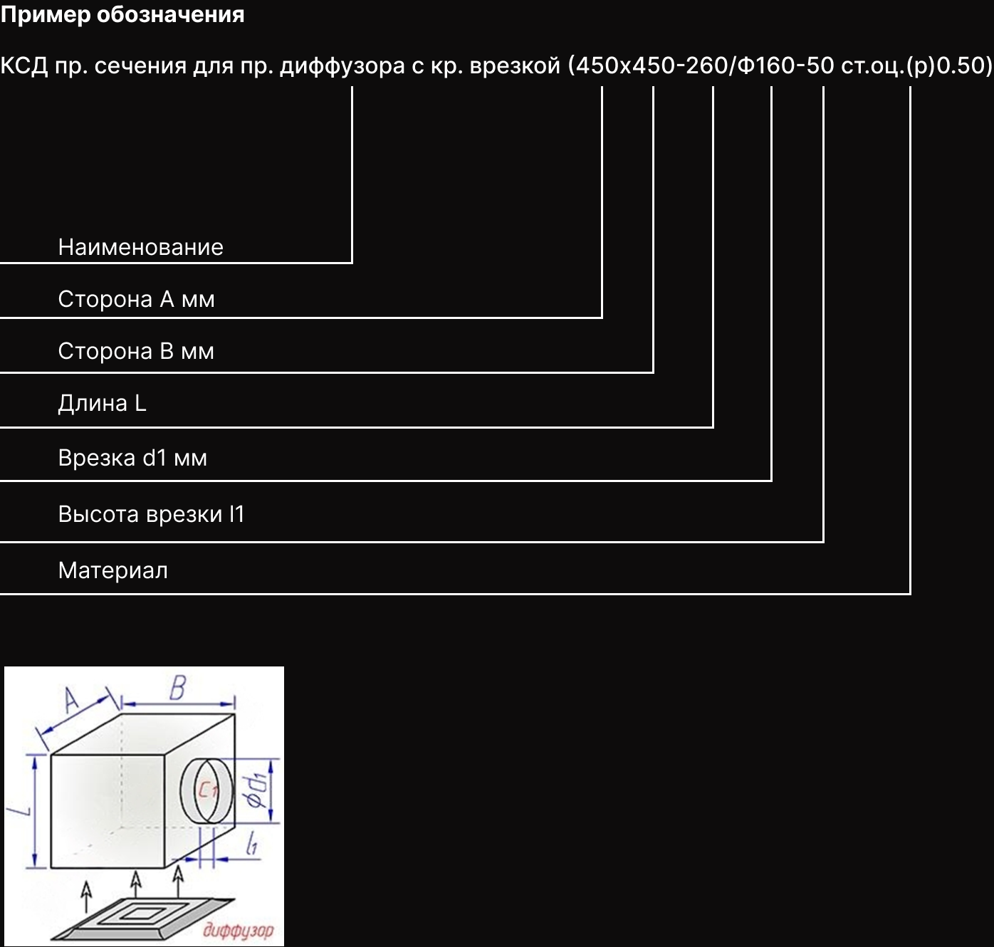 | КСД пр. сечения для кр. диффузора с кр. врезкой | Ф125-50/200×200-225/Ф125-50 | ст. оц.(р)0.50 | 0,332 | 1,30 | |