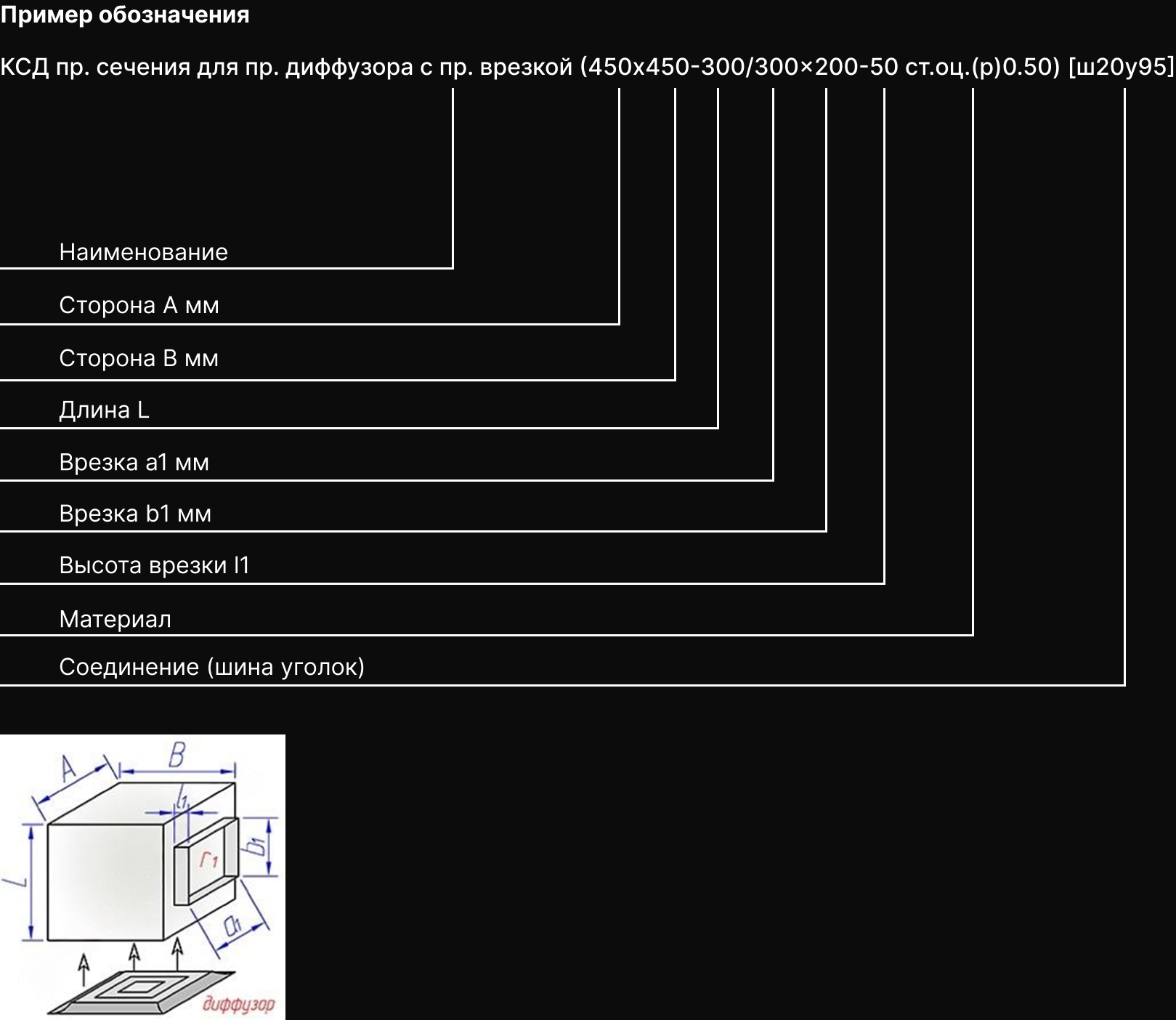 | КСД пр. сечения для пр. диффузора с пр. врезкой | 450×450-300/300×200-50 | ст. оц.(р)0.50 | ш20у95 | 0,81 | 3,18 |
