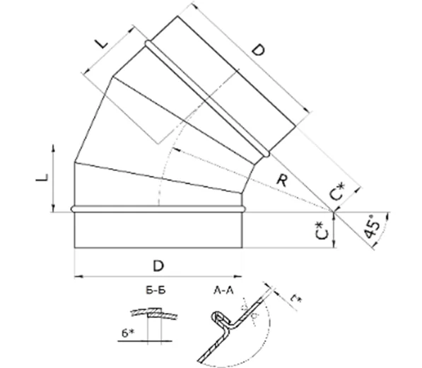 | Диаметр-угол-Радиус R мм | Материал | Шейка С | Монтажная длина L (стандарт R=D) | Площадь м2/шт. | Вес кг/шт |