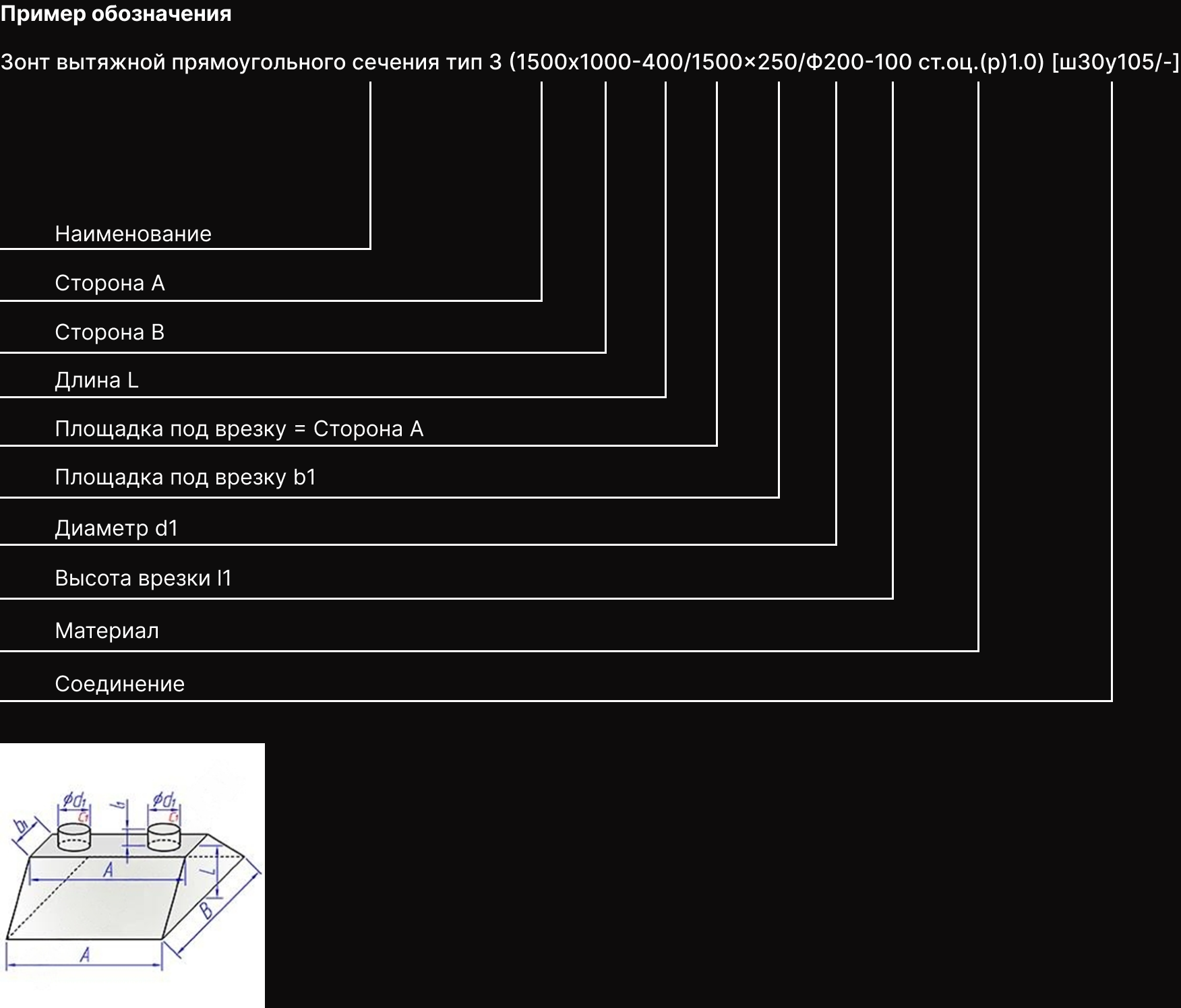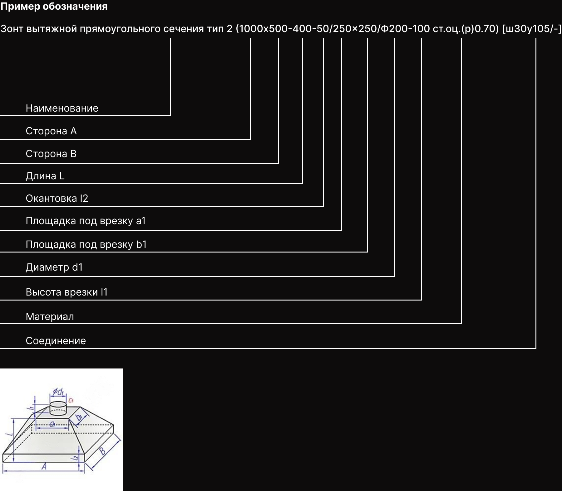 | Зонт вытяжной прямоугольного сечения тип 1 | 1000×500-400/250×250/Ф200-100 | ст.оц.(р)0.70 | ш30у105/- | 1,03 |